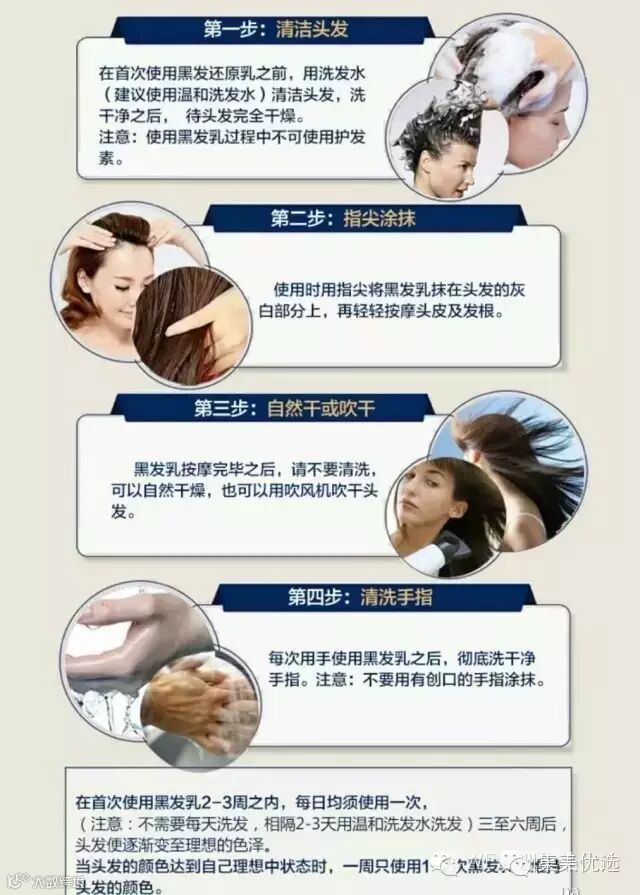 6.每次用手使用黑发乳之后,彻底洗干净手指。注意:不要用有破损肌肤的手指用黑发乳