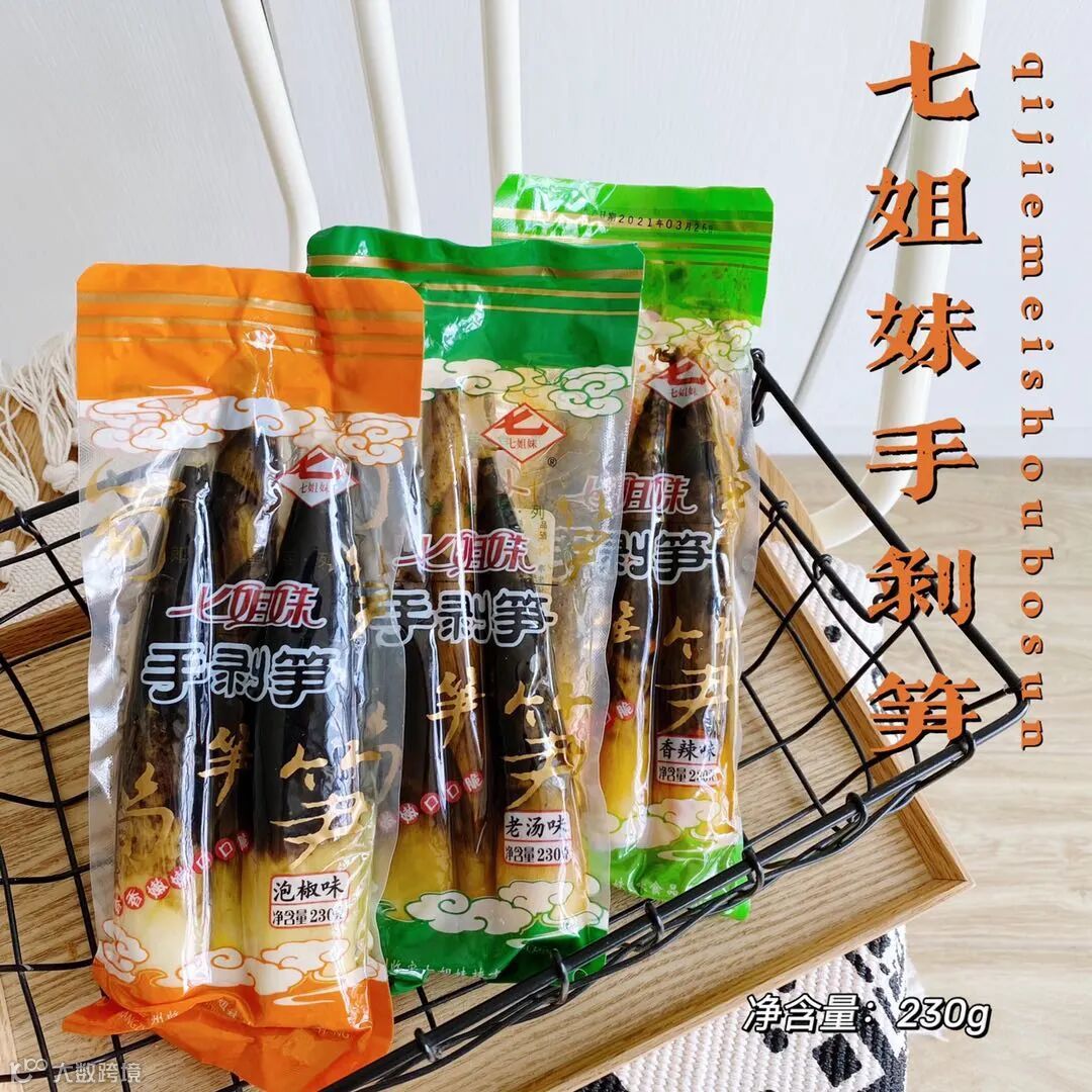 3、3种口味,总有一款适合你 七姐妹临安手剥笋, 有用高汤精熬 浸泡而成的老汤味, 竹笋的常见拍档泡椒味, 以及鲜辣过瘾的香辣味, 每种口味都能刺激出 竹笋的不同风味, 总有一款适合你 ![]()