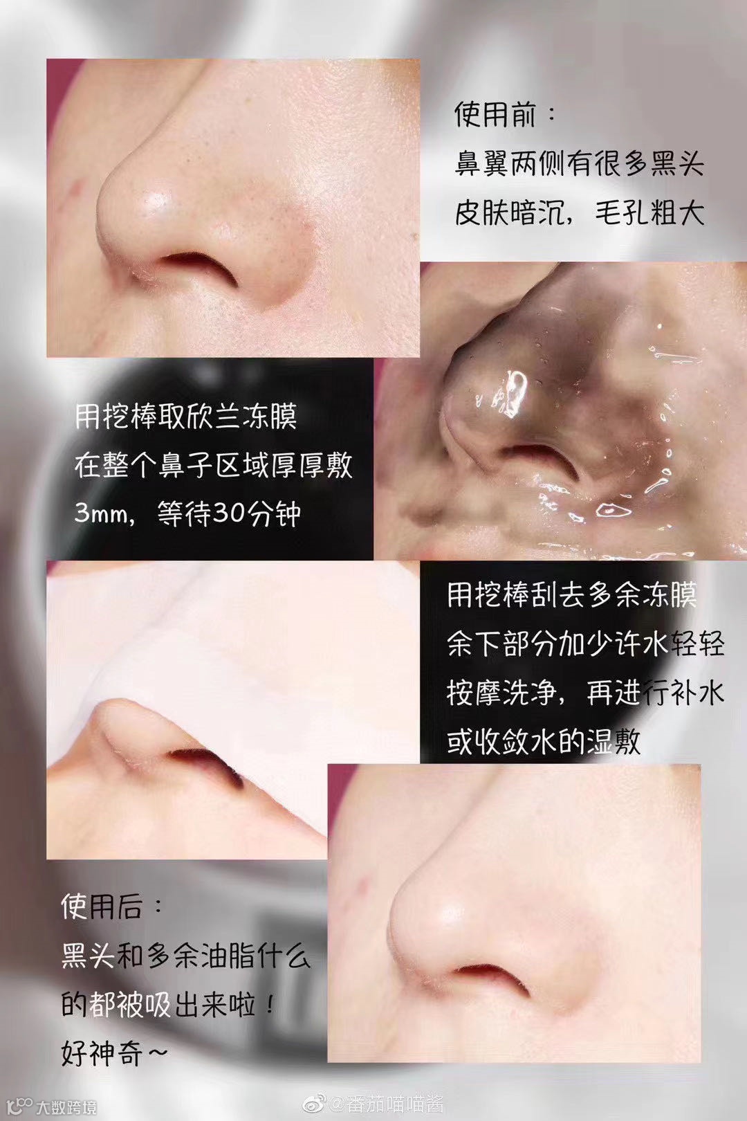 皮不敏感,还有毛孔大黑头粗的人可以这样试试看。反正口碑还挺不错,有的人很爱这一口,就像亲手拍死蚊子一样的快感。我皮肤敏感没敢这样弄,还有我黑头白头本来就比较少,所以浮出来后,我就用手搓搓揉揉,然后用清水洗净就OK。
