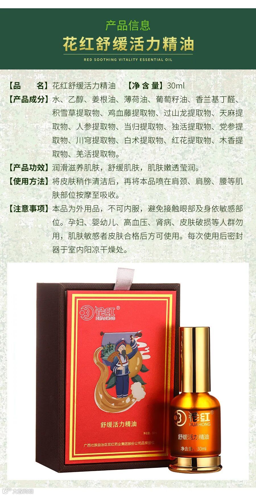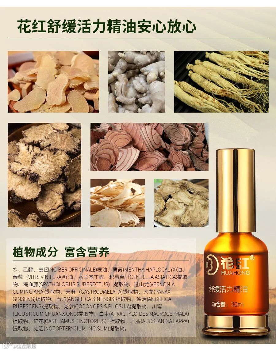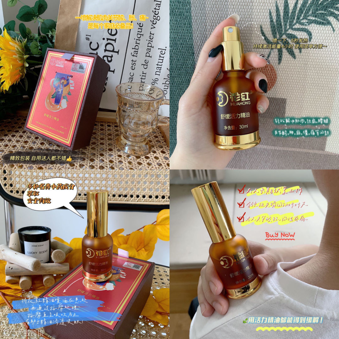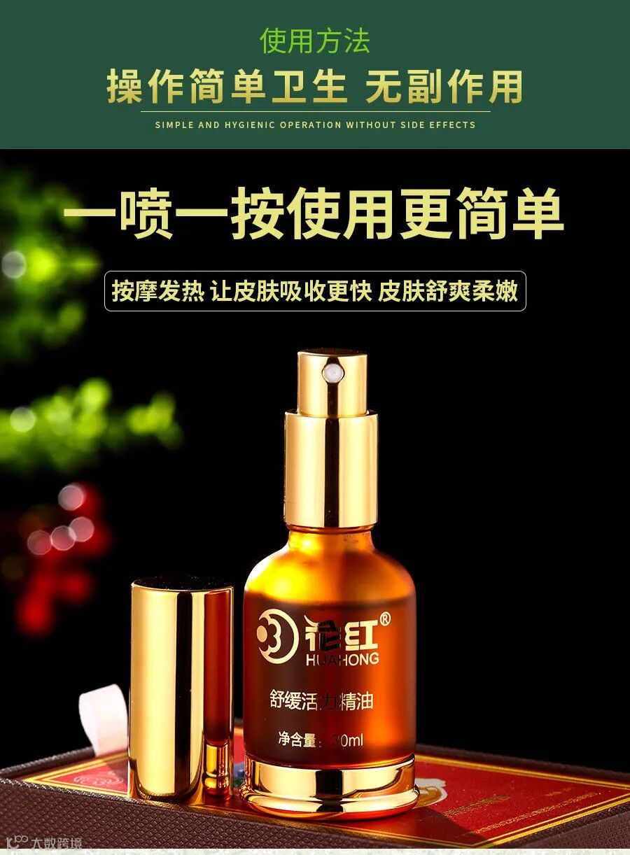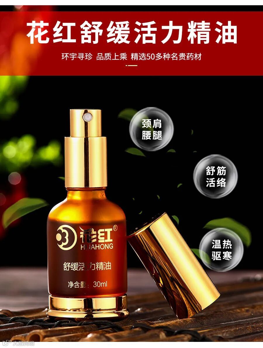 多种名贵中药成分萃取,安全有效 将花红精油喷洒在患处,再通过按摩处理 按摩直至吸收为止,有助于精油渗透皮肤。 ![]()