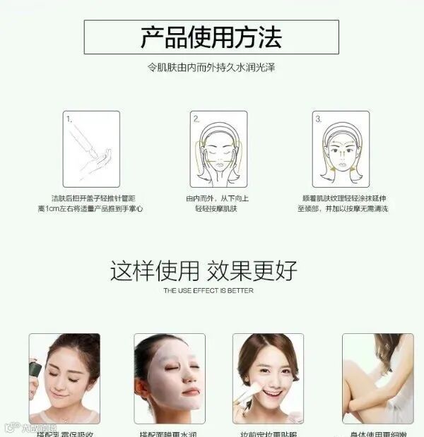 使用方法:洁面、爽肤后,取适量本品均匀涂抹于脸部及颈部,轻柔按摩片刻至充分吸收即可。