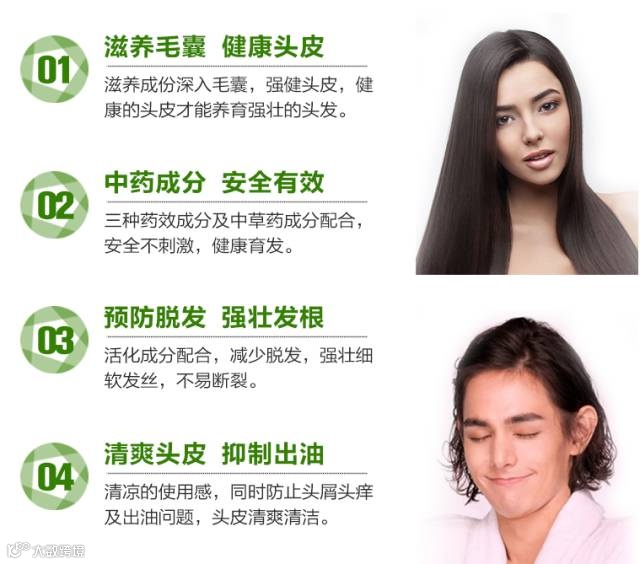 主要功功效:育发、养发、促进毛发生长,预防头皮屑、发痒、脱发、少发,药效成分能增强毛囊、细胞活性,预防脱发,促进新发的生长,天然保湿成分能滋润头皮, 保持头皮清洁、防止头皮屑、发痒等造成的脱发。
