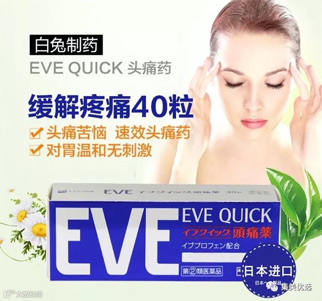 日本药品的标准比较严格,品质值得信赖!日本白兔牌EVE止痛解热片主要成分是伊布普洛芬,是一种止痛剂。 注意事项:不能和其他止痛药、退烧药、感冒药、镇定剂同时服用。服用完不能开车或操作机械,服用前后不能饮酒。
