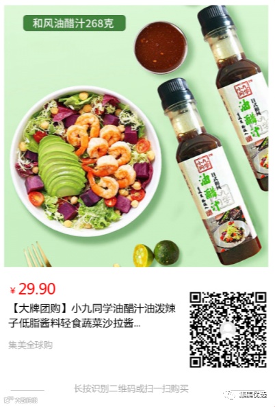 【大牌团购】小九同学油醋汁油泼辣子低脂酱料轻食蔬菜沙拉酱水煮菜炒菜 原价:39.9元 大牌团购价:29.9元 今日份给集美们安排两款优选蘸料,