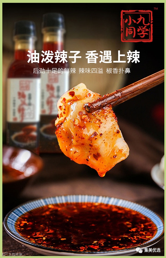 小九同学油泼辣子也是同样值得品尝,每一份美味的口感都来自于小九同学独家手作秘制,色泽红润油亮,香味扑鼻,辣而不燥、香而不呛,刚刚好的辣味,刚刚好的香味。