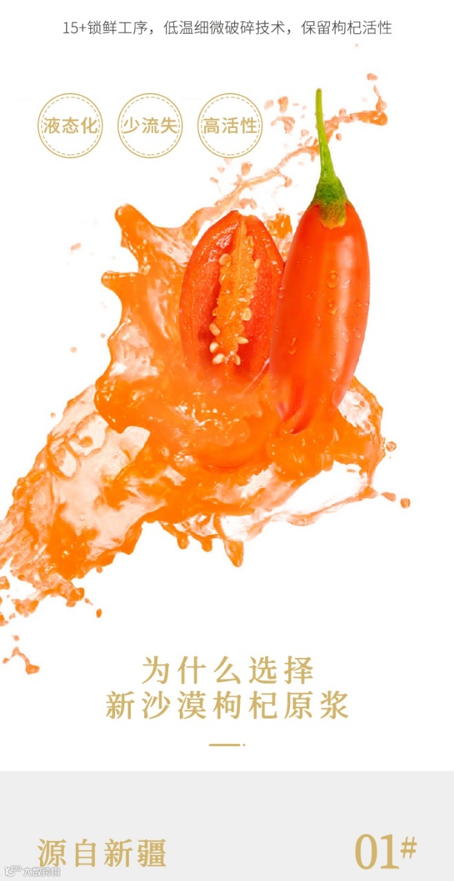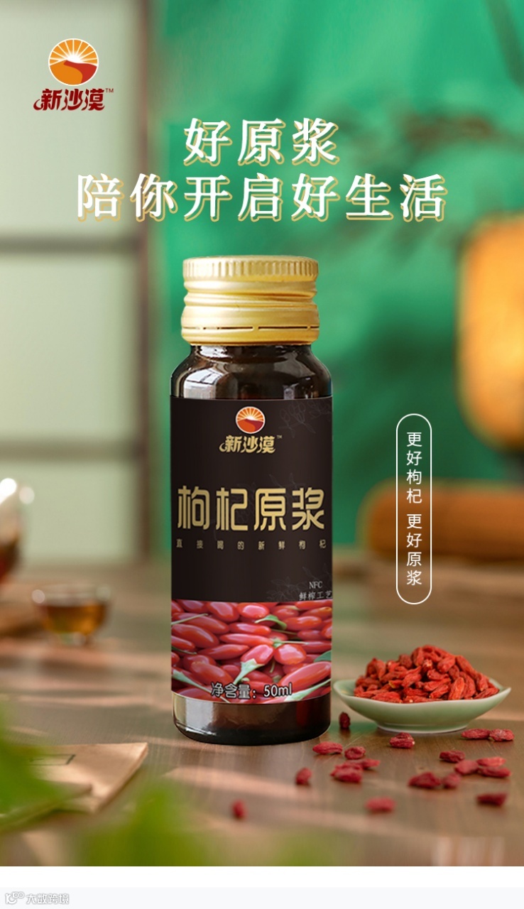 “新沙漠的枸杞原浆,不加一滴水,用新鲜采摘的优质枸杞鲜榨而成,每一滴都是原汁原味的枸杞精华。