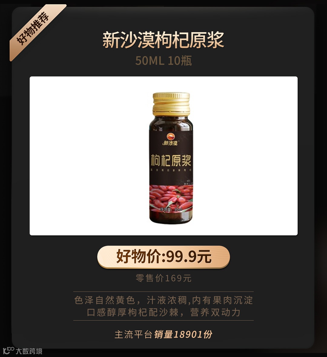 【大牌团购】 新沙漠枸杞原浆 50ml X 10瓶 原价:169元 大牌团购价:99.9元 新沙漠枸杞原浆 50ml X 10瓶