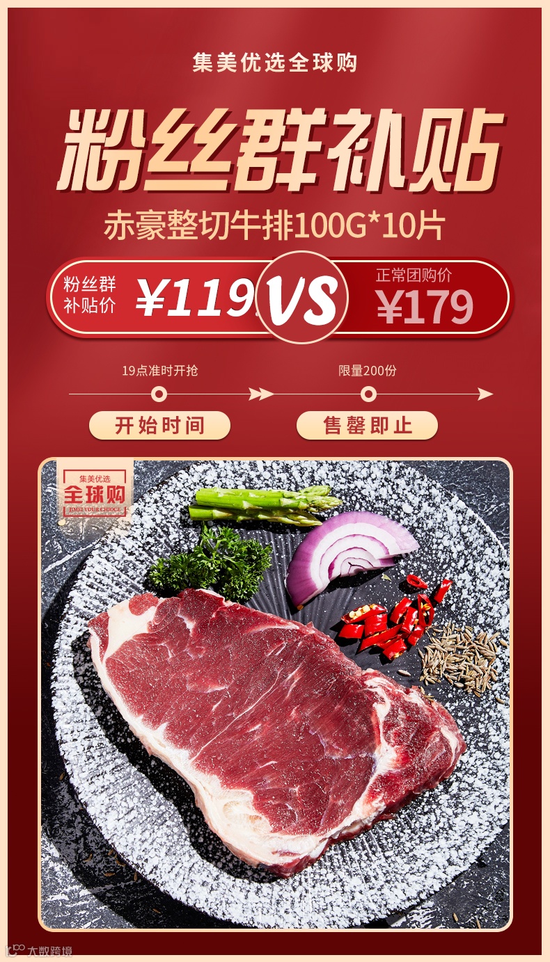 【粉丝群补贴】赤豪整切牛排100g*10片 原价:179元 粉丝群补贴价:119元起