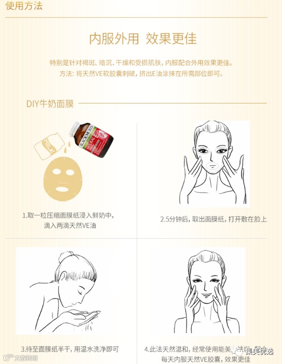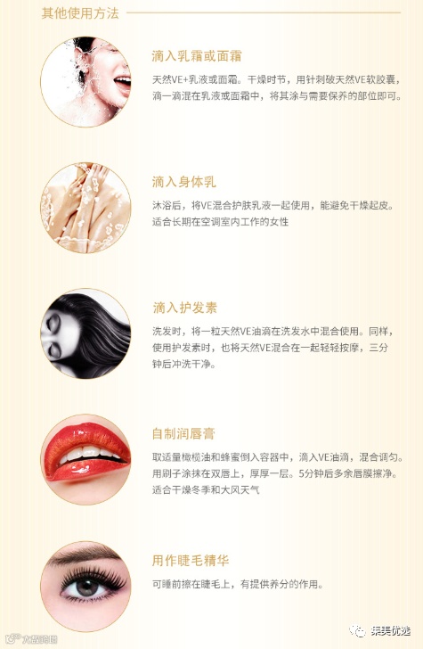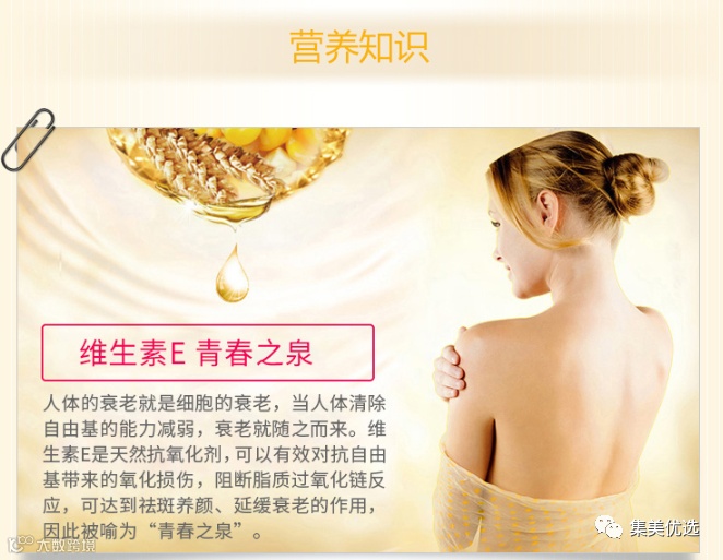 内服外用,效果更佳,素有“皮肤保湿剂”之称的VE,不但能帮你锁住皮肤水分,还可以抗氧化!每天擦两次,让你拥有像瓷娃娃一样的肌肤!