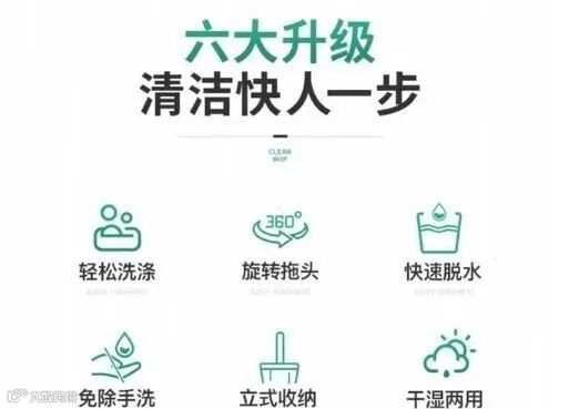 【六大升级 】:1、轻松洗涤 2、360°旋转拖头 3、快速脱水 4、免除手洗 5、立式收纳 6、干湿两用