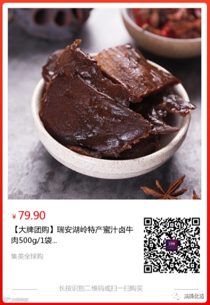 【大牌团购】瑞安湖岭特产蜜汁卤牛肉 500g/1袋 原价:99元 大牌团购价:79.9元 湖岭,位于温州西部山区,境内大部分为丘陵山地,中部为河谷平原,青山绿水环绕,气候宜人,空气清新,生态环境优美。湖岭镇素有“黄牛之乡”“牛肉之乡”的美誉。农民饲养黄牛历史悠久。湖岭黄牛,又称“瓯越膘黄牛”被誉为“中国中原四大牛种之一”。