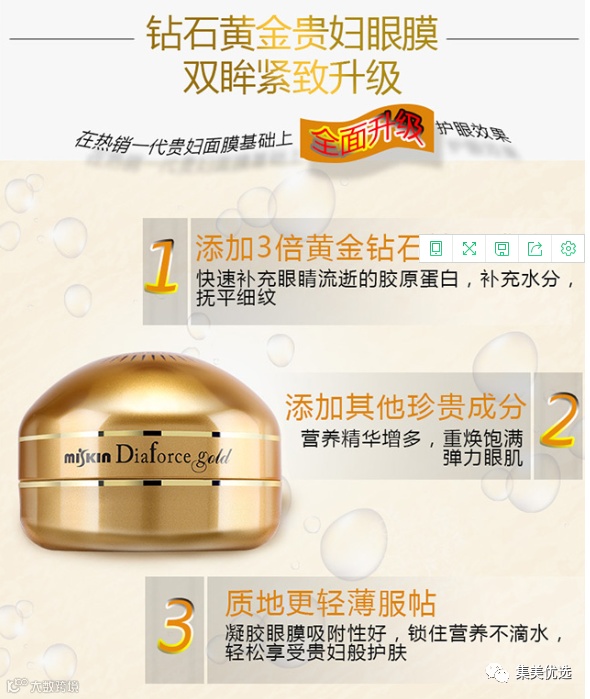 水凝胶状面膜贴,不油腻,质地清爽,使用感湿润。24K黄金的有效成分帮助预防眼周围肌肤老化并打造充满活力的肌肤。内涵钻石粉,帮助打造嫩滑的肌肤。~有很强的去黑眼圈和小细纹的功效,是现代OL的最爱。