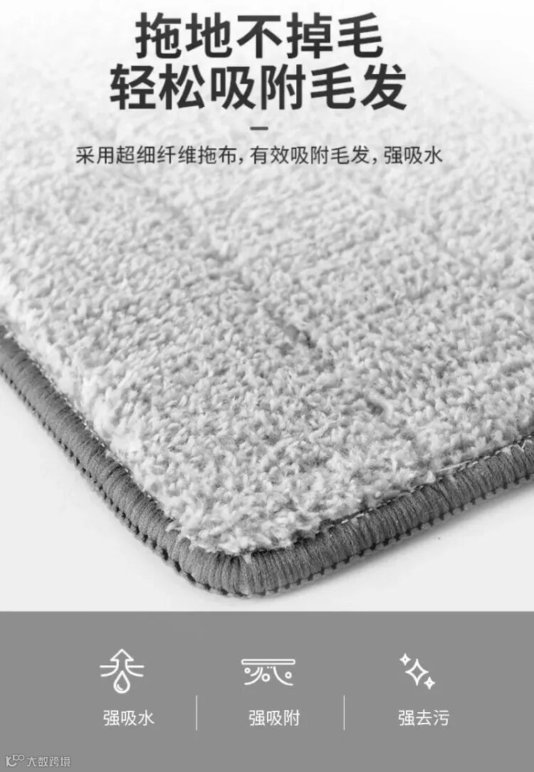 【超细纤维】超细纤维拖布,高吸附力,去除顽固污渍去污层:超细纤维,去污力好缝合层:吸水和去污层融合吸水层:吸收液体和污渍粘合层:拖把和拖布融合