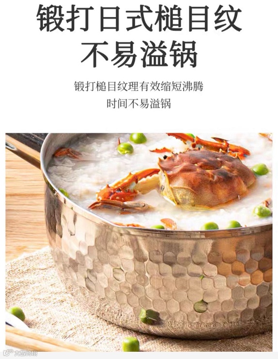 锅身布满均匀的凹凸锤纹。锤纹可以防止溢锅
