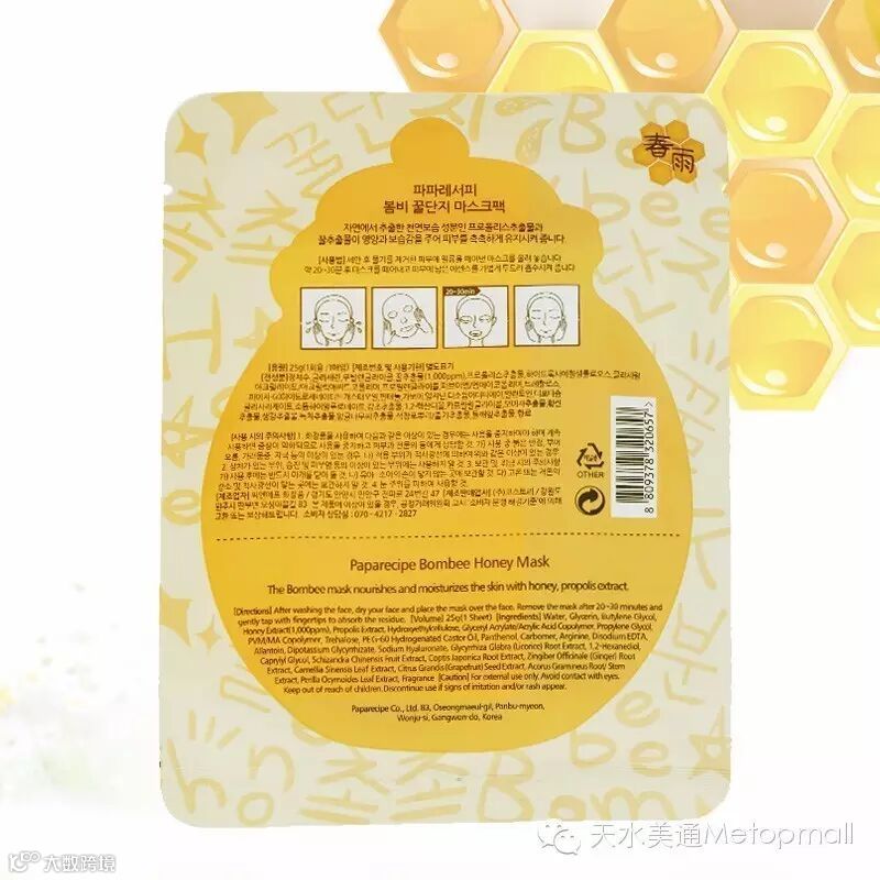 春雨面膜中87%都是蜂蜜原液,其他成分有,五味子提取物,生姜提取物,柑桔种子提取物,野茶树提取物,黄连提取物,紫苏叶提取物,石菖蒲提取物等等。全部都是植物成分,完全没有化学添加,更没有防腐剂。