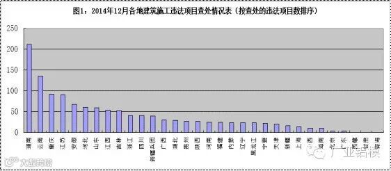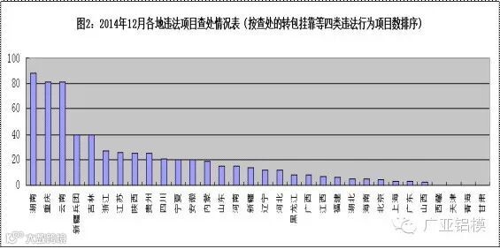 2014年12月,全国各地共排查建筑工程项目41743个,涉及27815家建设单位,33278家施工企业。经查,共有1276个项目存在各类市场违法行为,其中,存在违法发包行为项目180个,存在转包行为项目87个,存在违法分包行为项目172个,存在挂靠行为项目193个,存在其它市场违法行为项目644个。