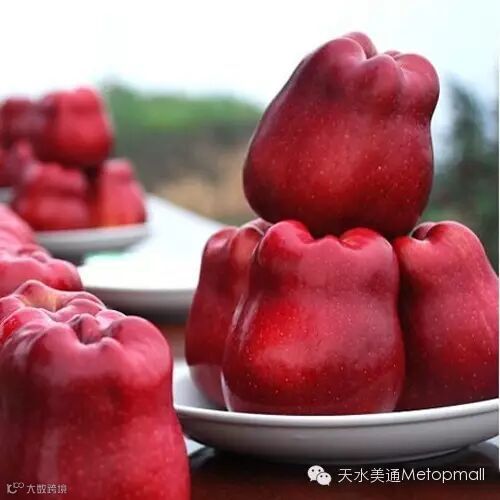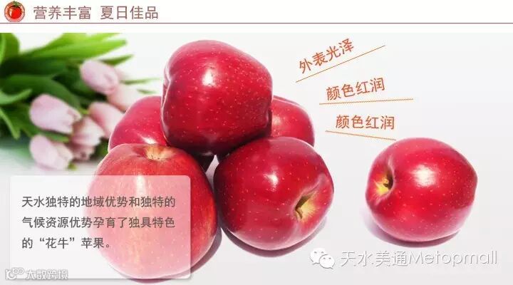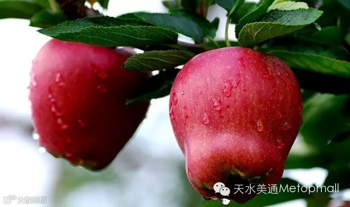 天水“花牛苹果“,是甘肃省天水市秦州区、麦积区、清水县、甘谷县、秦安县部分宜植地区特产,为中国国家地理标志产品。花牛苹果除元帅系产品质量上乘外,富士色、香、味也俱佳。其产品肉质细,致密,松脆,汁液多,香气浓郁,口感好,风味独特。被许多中外专家和消费者认可可与美国蛇果、日本富士相媲美的世界三大著名苹果品牌名果。花牛苹果成就名果的必要条件是,一是天水独特的气候优势。二是种植区文化深厚且远离污染。三是种植历史较长和有几代人的技术延续。其子品牌目前有,潘苹果、党代表苹果、果小妹、我与乔布斯苹果等。