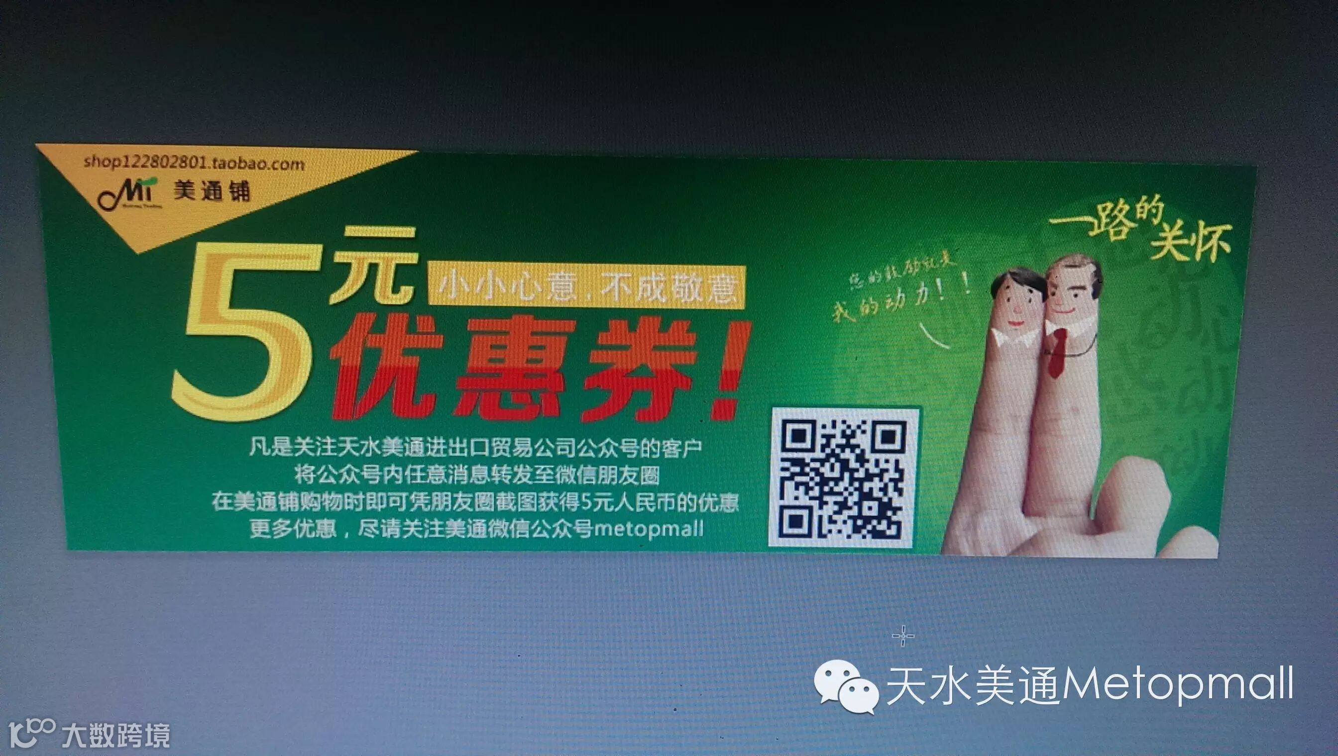 凡是关注天水美通进出口贸易公司公众号的客户,将公众号内任意消息转发至微信朋友圈,在美通铺(https://shop122802801.taobao.com)购物时即可凭朋友圈截图获得5元人民币的优惠。更多优惠,尽请关注美通微信公众号metopmall。更多惊喜,尽在淘宝店铺:美通铺