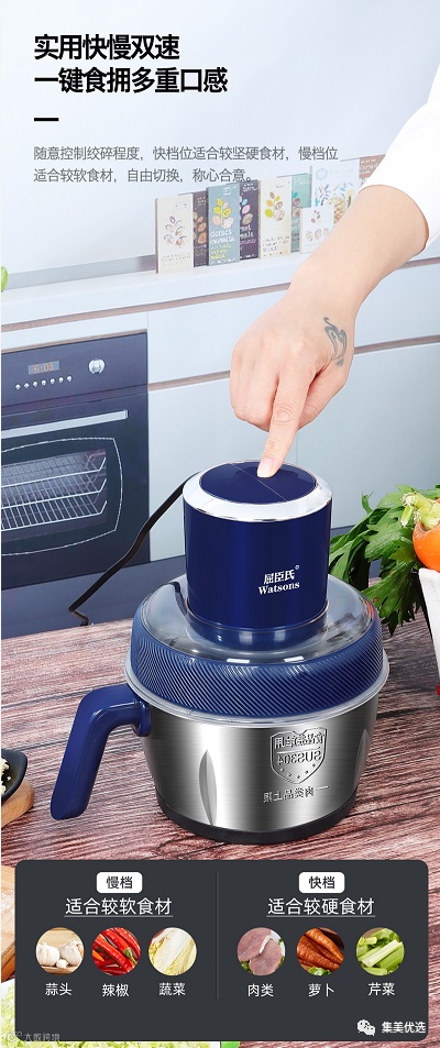 产品特点:内部双层四刀,每一片都采用8度黄金弯曲角度,可以全方位进行切割快慢双速,纯铜电机,快档绞菜类,慢档绞肉。