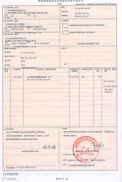 台湾产地证,ECFA产地证,海峡优惠产地证