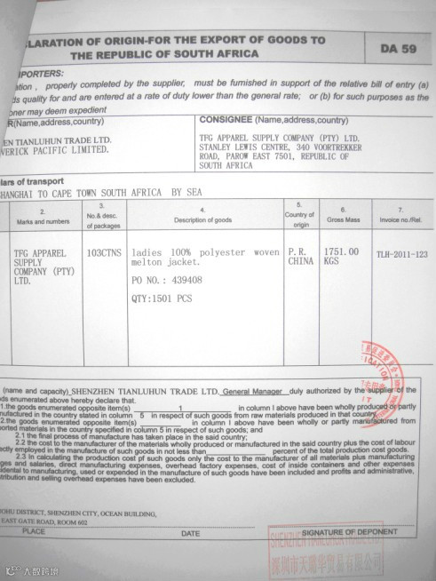 7、《南非原产地声明一格式DA59》据南非海关与关税委员会订立的《海关与关税规则》规定:自1994年11月1日后运往南非的货物①木浆及其它纤维原料的纤维素纸浆,纸或纸板的边角碎料和废品;纸、纸板及其制品②纺织原料和纺织制品③石料、石膏、水泥、石棉、云母及类似材料制品;陶瓷产品,玻璃和玻璃制品④贱金属及其制品⑤机器及机械设备;电气设备及零部件;声音的录制设备和重放设备;电视图像及声音的录制设备和重放设备及此类制品的零件和附件。⑥杂项制品⑦化学工业及相关工业的产品,必须出具“南非原产地声明一格式DA59”(Declaration of Origin Form DA59)。