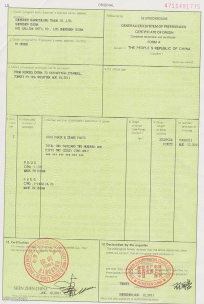 2、FORM A普惠制原产地证明书,是具有法律效力的我国出口产品在给惠国税率基础上进一步减免进口关税的官方凭证。世界给予我国优惠的国家有38个(也就是说,只有出口到这些国家才做F/A):欧盟27国(比利时、丹麦、英国、德国、法国、爱尔兰、意大利、卢森堡、荷兰、希腊、葡萄牙、西班牙、奥地利、芬兰、瑞典、波兰、捷克、斯洛伐克、拉脱维亚、爱沙尼亚、立陶宛、匈牙利、马耳他、塞浦路斯、斯洛文尼亚、保加利亚、罗马尼亚)、挪威、瑞士、土耳其、俄罗斯、白俄罗斯、乌克兰、哈萨克斯坦、日本、加拿大、澳大利亚和新西兰。全称:GENERALIZED SYSTEM OF PREFERENCES CERTIFICATE OF ORIGIN 。