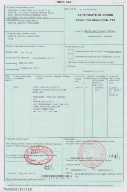 4、中国—智利自由贸易区原产地证书(FORM F) 中华人民共和国政府和智利共和国政府自由贸易协定 ,单个中国-智利自贸区FORM F原产地证书!