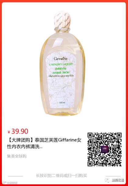 【大牌团购】泰国芝芙莲Giffarine女性内衣内裤清洗液洗衣剂家庭用装留香500ml 原价:69元 大牌团购价:39.9元 今天给大家推荐这款——泰国芝芙莲内衣裤洗衣液!抗菌抑菌、去污、去异味!不仅血渍、连口红印子都能洗的很干净,