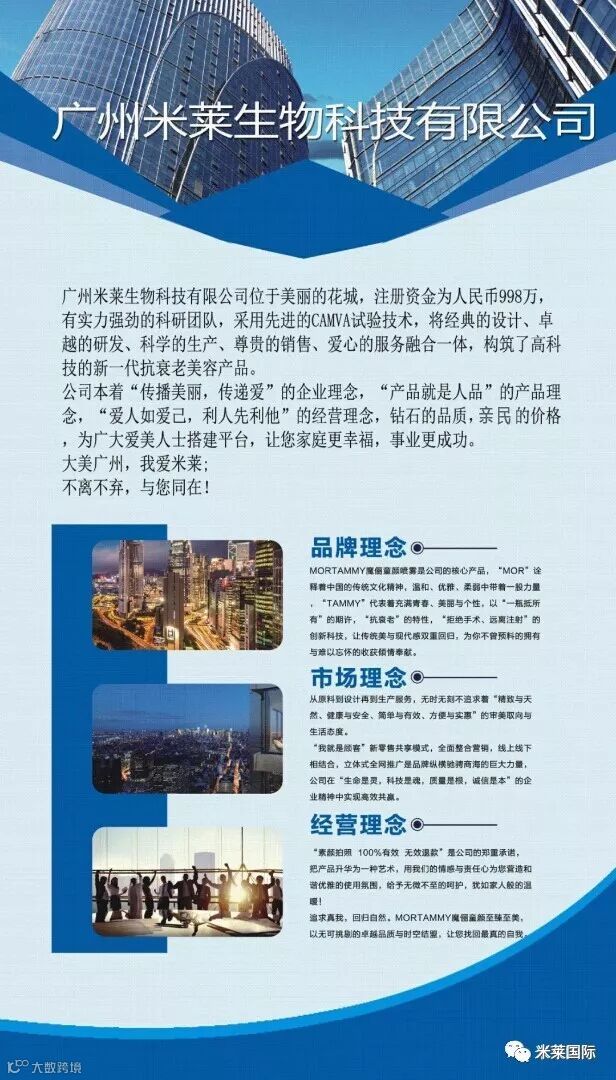 广州米莱生物科技有限公司位于美丽的花城,注册资金为人民币998万,有实力强劲的科研团队,采用先进的CAMVA试验技术,将经典的设计、卓越的研发、科学的生产、尊贵的销售、爱心的服务融合一体,构筑了高科技的新一代抗衰老美容产品。
