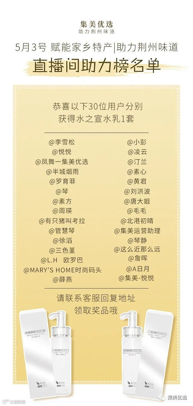 导读:直播助力榜单邀请好友围观集美直播间邀请满30人赠送价值199元水の宣水乳1套