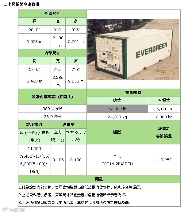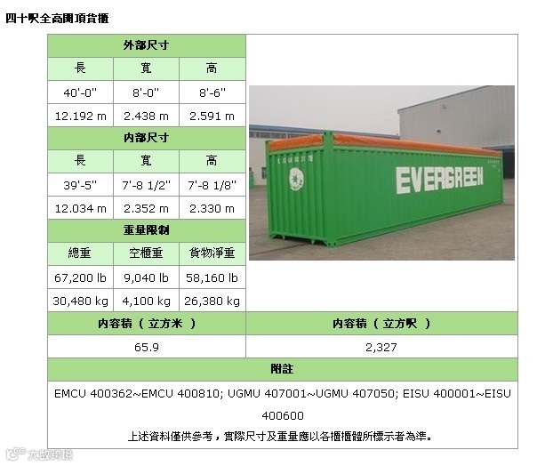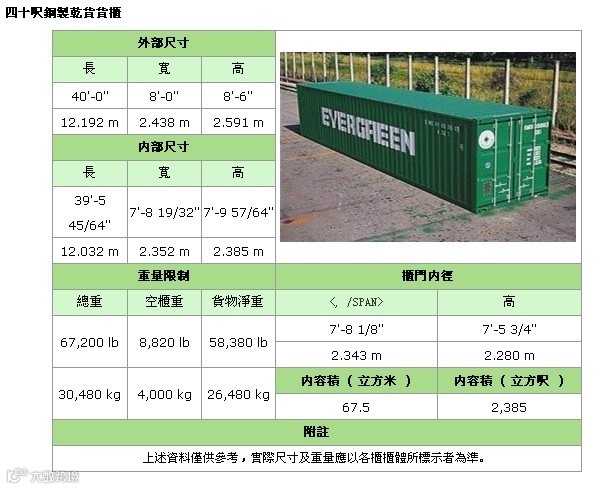 备注:集装箱是按照国际通用标准设计制造。因为制造工厂繁多,所以每个船东的集装箱尺寸会略有差别,但都是大同小异。
