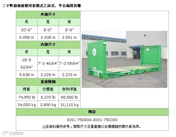 备注:集装箱适用于装载大型货物和重货,如钢铁、木材,机械,特别是像玻璃板等易碎的重货