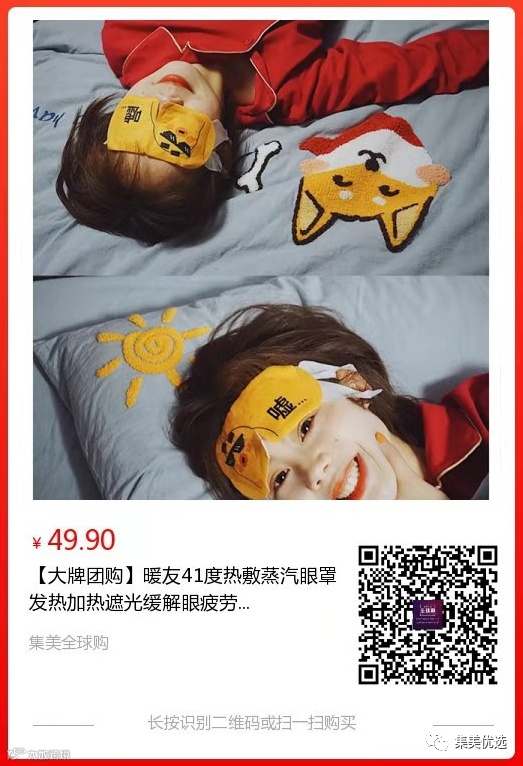 【大牌团购】暖友41度热敷蒸汽眼罩 2盒 原价:89元 SVIP福利补贴价:49.9元 今天给你们安利一款具有专利的眼罩, 暖友41℃蒸汽眼罩~ 可以缓解眼睛疲劳,同时又能美容! 41℃蒸汽眼罩5秒速热,
