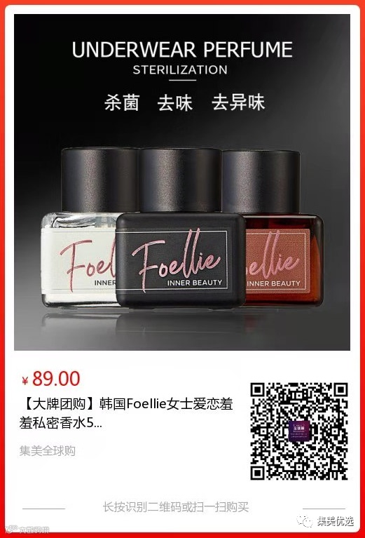 【大牌团购】韩国 Foellie 女士爱恋羞羞私密香水5ml*1瓶 原价:89元 SVIP福利补贴价:79元 2018年4月,FOELLIE品牌在韩国创立,推出的3款私密处香液,因独特的包装设计和很好的效果,一经问世就创造了每月破50万支的高销量纪录.