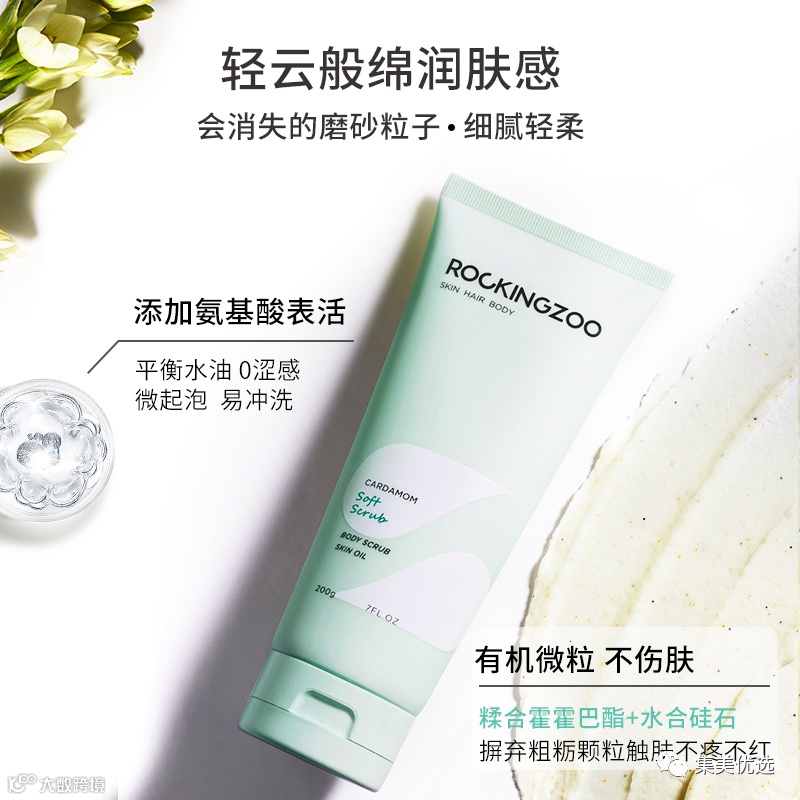 添加氨基酸表活因子,平衡水油,0涩感,微气泡,易冲洗,融合霍霍巴脂和水合硅石,既有颗粒的磨砂感,又不会像大颗的磨砂膏在身上搓“沙”,不会带来二次伤害。
