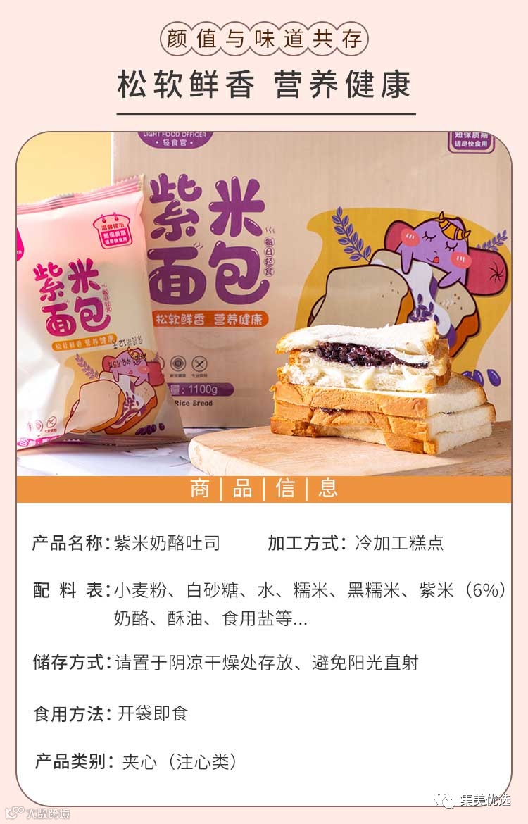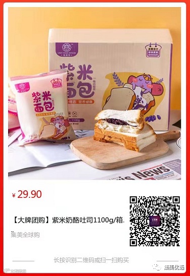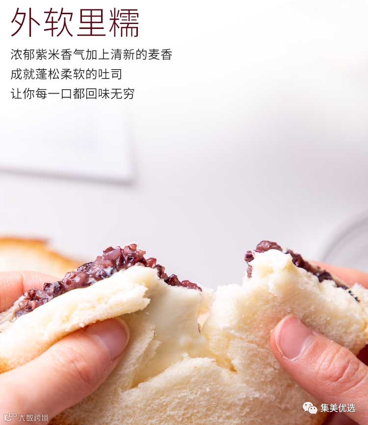【大牌团购】紫米奶酪吐司 1100g/箱 原价:39.9元 SVIP福利补贴价:29.9元 对于上班族来说,能每天多睡十分钟简直太幸福了,有了今天这款美味健康的紫米奶酪吐司 ,多睡十分钟不再是遥不可及的梦,新鲜的紫米唤醒一天的味蕾,香酥的吐司让你意犹未尽,低脂的乳酪让你流连忘返。早餐来不及吃,没有关系!有了紫米面包,营养美味一包全解决。