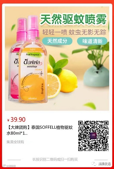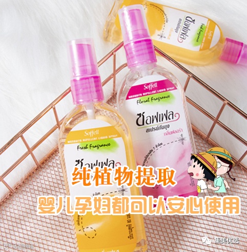 【大牌团购】泰国 SOFFELL 植物驱蚊水80ml*1瓶 原价:69元 SVIP福利补贴价:39.9元 夏天到来,各种蚊虫也苏醒了,相信爱穿短裙短裤的妹子们,家里有小孩的宝妈都会对蚊虫叮咬而烦恼吧?今天给大家推荐泰国soffee防蚊水,无论出门还是在家,喷一喷,和蚊子说拜拜~