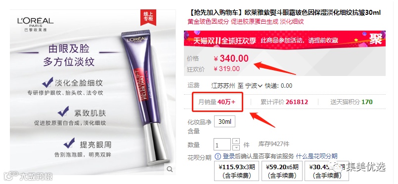 都知道旗舰店打折,双十一的价格基本是抄底价了。 欧莱雅紫熨斗眼霜,旗舰店当时双十一的狂欢价是:319元
