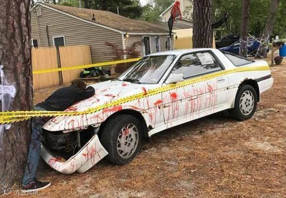 发生车祸了吗?当然不是!这是美国纽泽西的一对夫妇为了迎接万圣节的到来,在自家庭院打造的一个"僵尸被车撞死"的车祸现场。他们自制了两个僵尸,一个被夹在树木与白色汽车中间,另一个则倒卧在车旁,车上都是以假乱真的血迹,四周围着黄色封锁线。由于场面太过逼真,有好几位邻居吓到报警。