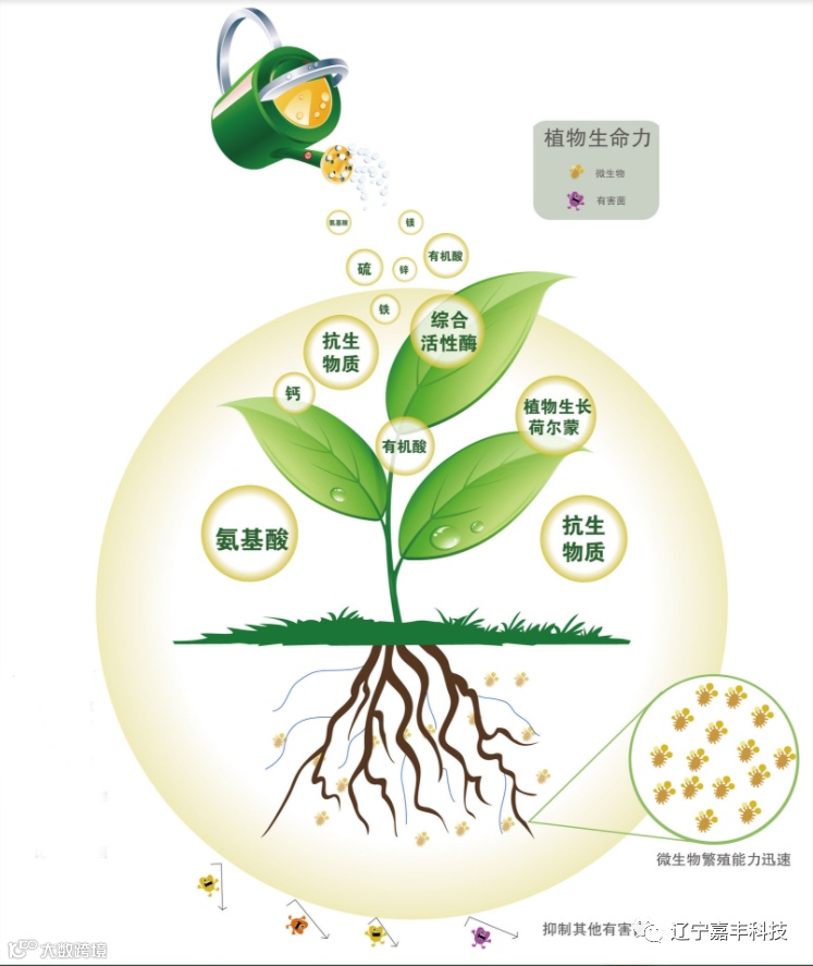 在根部增加有益菌群,提高氮磷钾以及其他营养的转化率,使得作物毛细根增加,从而提高作物产量10-20%