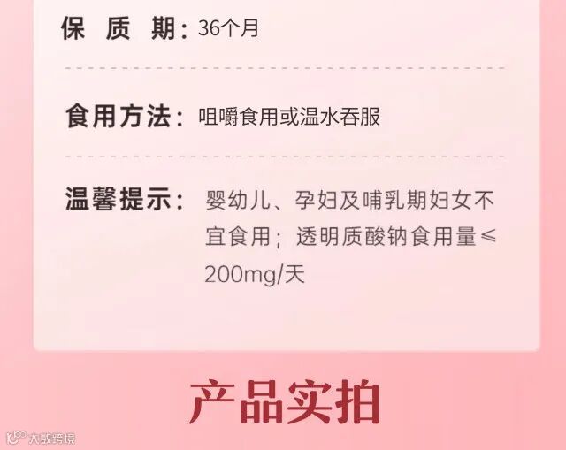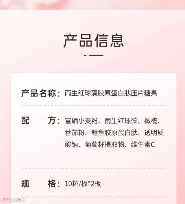 【成分】:山梨糖醇、麦芽糊精、富硒小麦粉、雨生红球藻、橄榄、番茄粉、鳕鱼胶原蛋白肽、透明质酸钠、葡萄籽提取物、维生素C(抗坏血酸)、柠檬酸、硬脂酸镁。