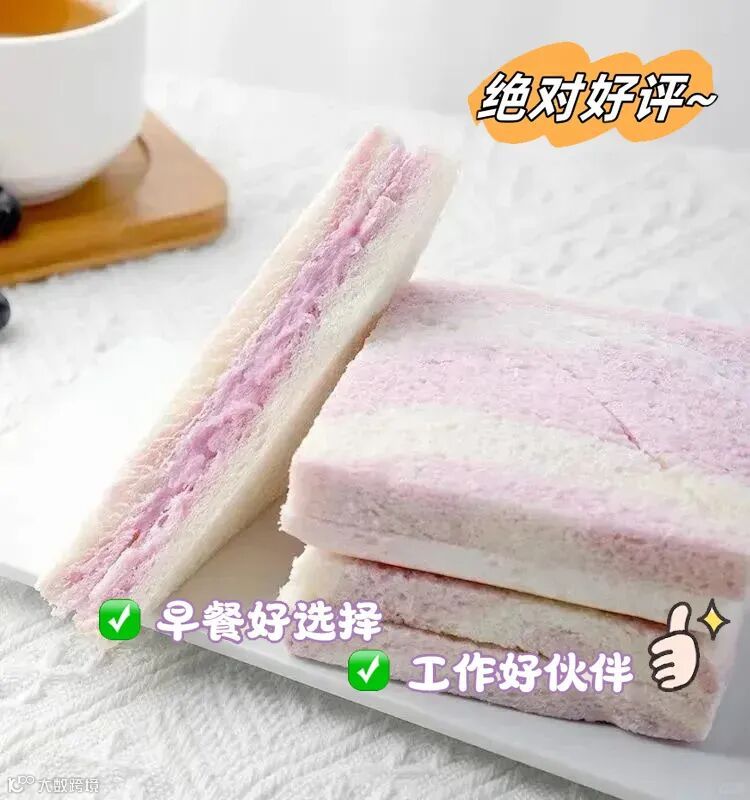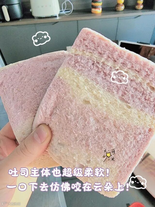 20%的芋头含量,加厚夹心用料扎实双色吐司口感绵软超绝!0脱氢乙酸钠,健康无压力!芋泥味道超足!给减脂早餐换换口味
