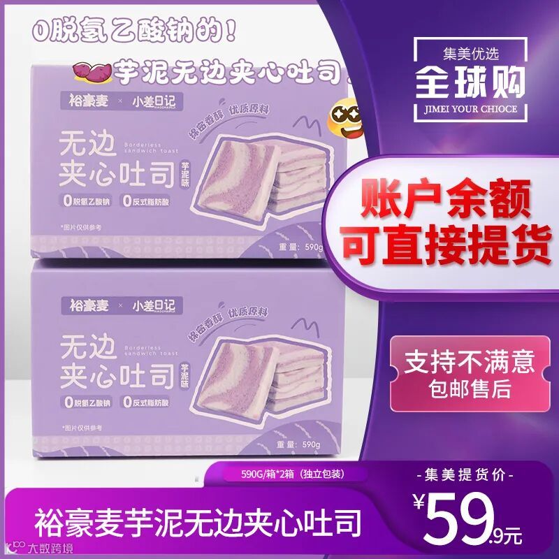 【余额提货】裕豪麦芋泥无边夹心吐司590g/箱*2箱(独立包装)