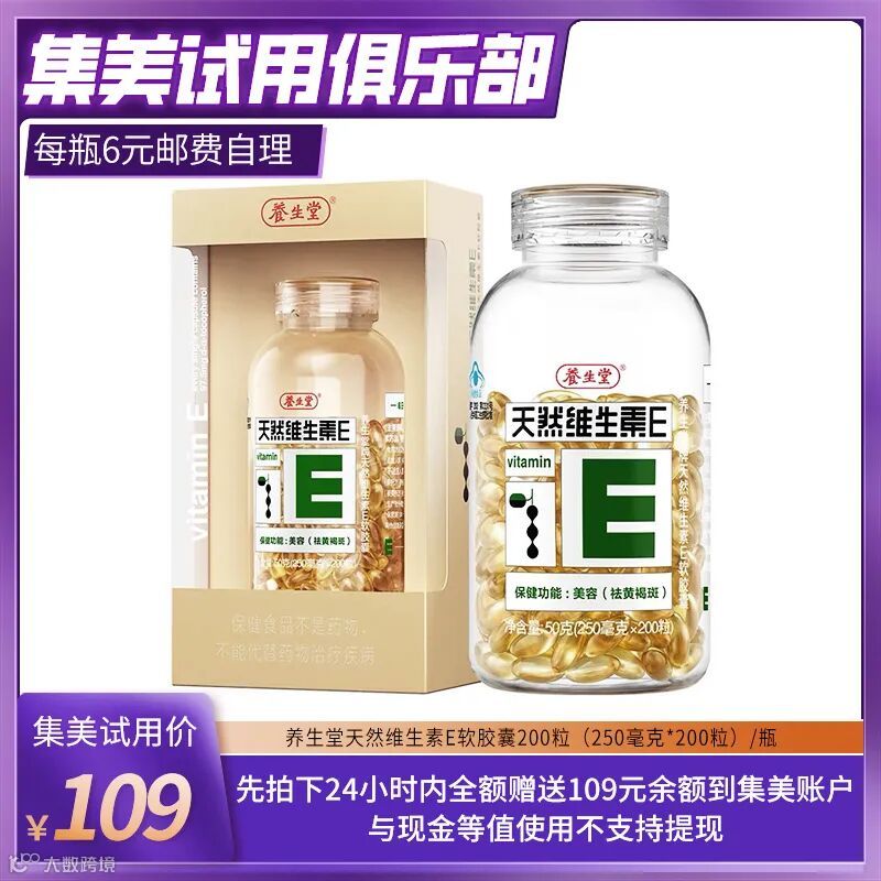 【试用补贴】养生堂天然维生素E软胶囊200粒/1瓶(250毫克*200粒)