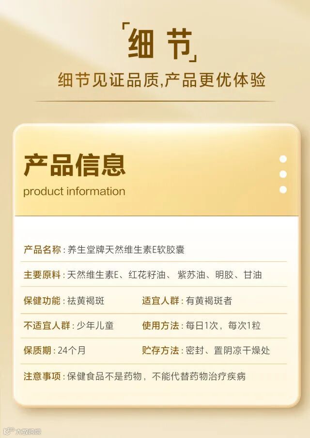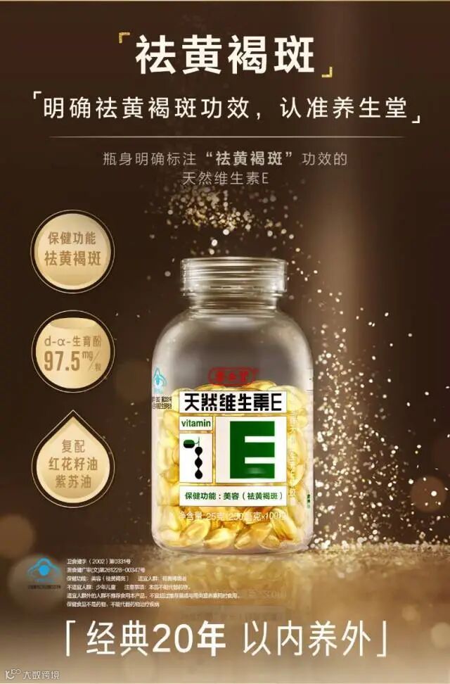 【卖点介绍】:养生堂明星保健产品,一款畅销20多年的好产品,国家食品药品监督管理局明确蓝帽子产品 ,只有养生堂的天然维生素E保健功效“美容祛斑,延缓衰老”,不管是送礼还是自己吃,爸妈吃,内服外用,美丽由内而外,效果超级棒哦。