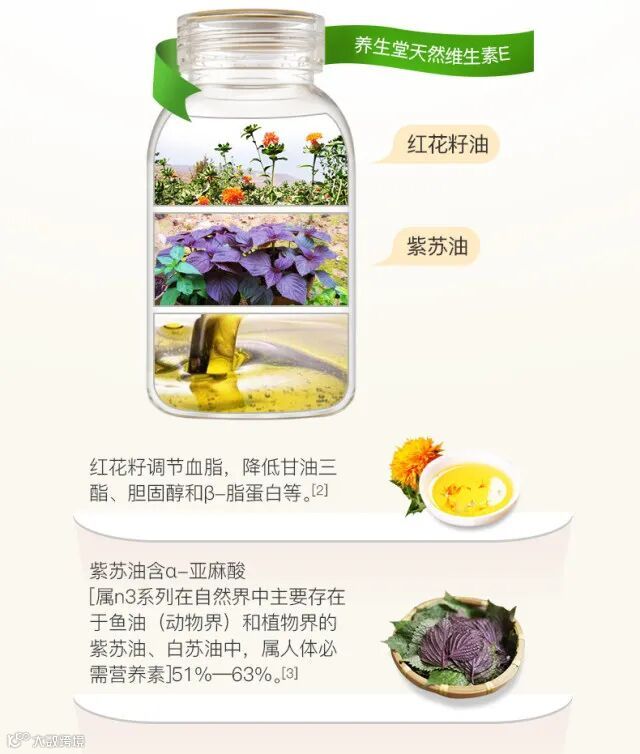 养生堂天然维生素E,除了高纯度VE外,还额外添加了红花籽油、紫苏油