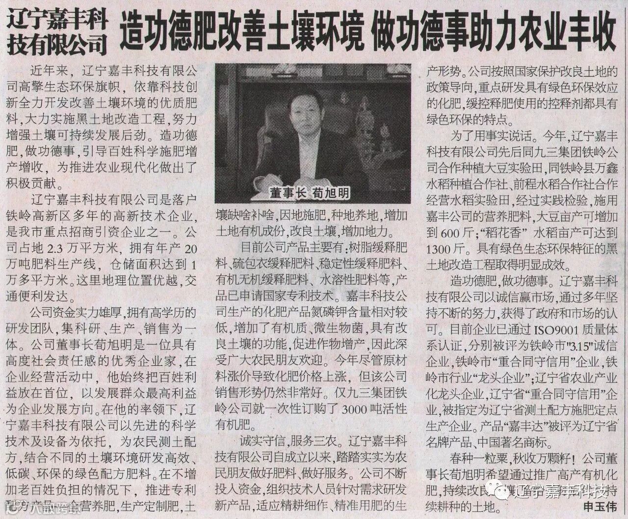 辽宁嘉丰科技有限公司多年来坚持以“造功能肥,做功德事”为企业理念,始终致力于建成高科技功能型生态肥的生产基地。今后,公司将继续在“科技、有机、生态”的道路上砥砺前行!欢迎广大朋友的监督指导。