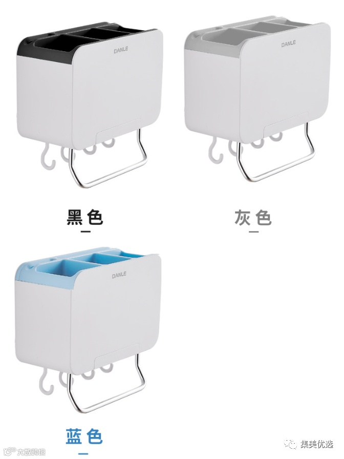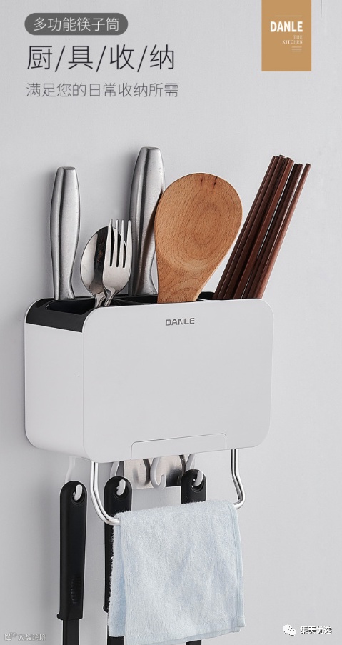 这款产品集多种收纳功能于一体,三个收纳格,用于放置筷子;有可以放置菜刀和水果刀的刀位;更配置了手机座、不锈钢毛巾杆、可活动挂钩~免钉壁挂,分类收纳