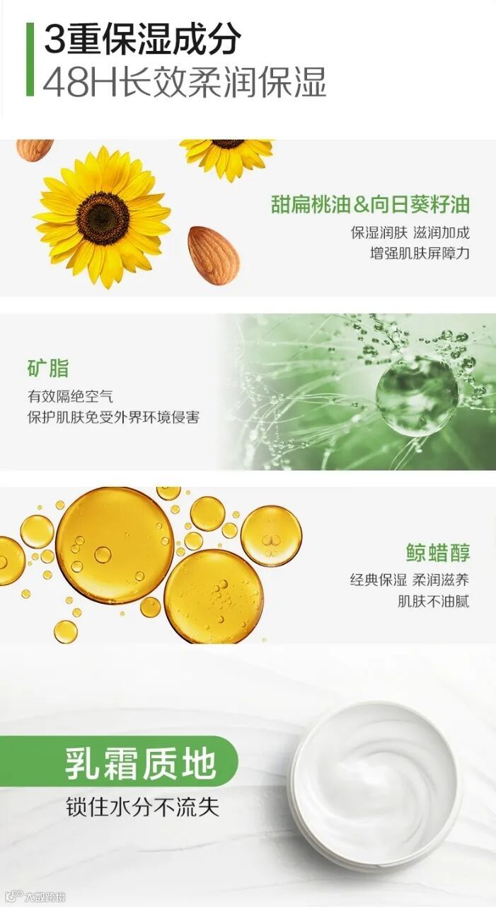 【主要成分】双重保湿成分:甜扁桃油+向日葵籽油,给干痒皮肤进行舒缓修护保湿修护力强大的鲸蜡醇成分强韧受损皮肤屏障,加强保湿优秀的锁水能力。保持皮肤水润充盈、长效保湿!