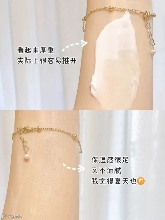 【质地】奶油般的乳霜质地,很好推开,抹开后稍微按摩吸收下,皮肤顿时滋润不少而且肤感很轻薄,一点也不会厚重。